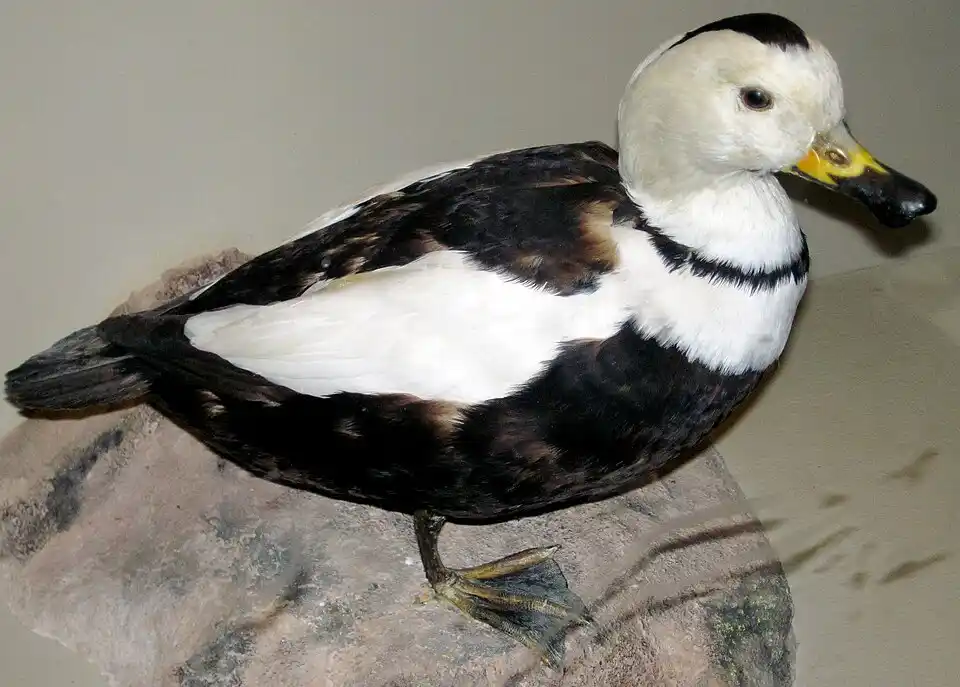 Description: Adult males had an entirely white head, neck, and scapular region, except for a black stripe extending from the crown to the nape and a black collar at the base of the neck. The cheeks had a yellowish area of stiffened feathers. Much of the rest of the body—including the tail, rump, back, primaries, and underparts—was black, while the wings were mostly white with black primaries. Females were generally uniformly brownish gray, with bluish slate tones on the back and lighter grayish brown underparts. Both sexes had a white speculum formed by the greater secondary coverts and secondaries. Juveniles apparently resembled adult females for most of their first year, with young males beginning to show white feathers on the head, throat, and breast by the end of their first winter.
